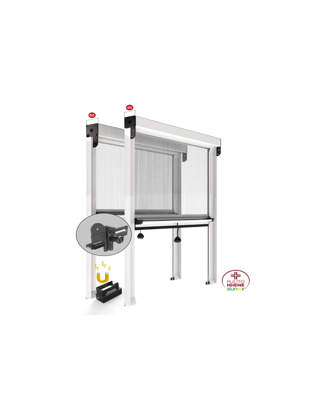 Zanzariera verticale ad avvolgimento a molla con bottoni sul telo, ideale per finestre e portefinestre. Disponibile con cassonetto da 40 o 50 mm, scorrimento verticale e aggancio magnetico.